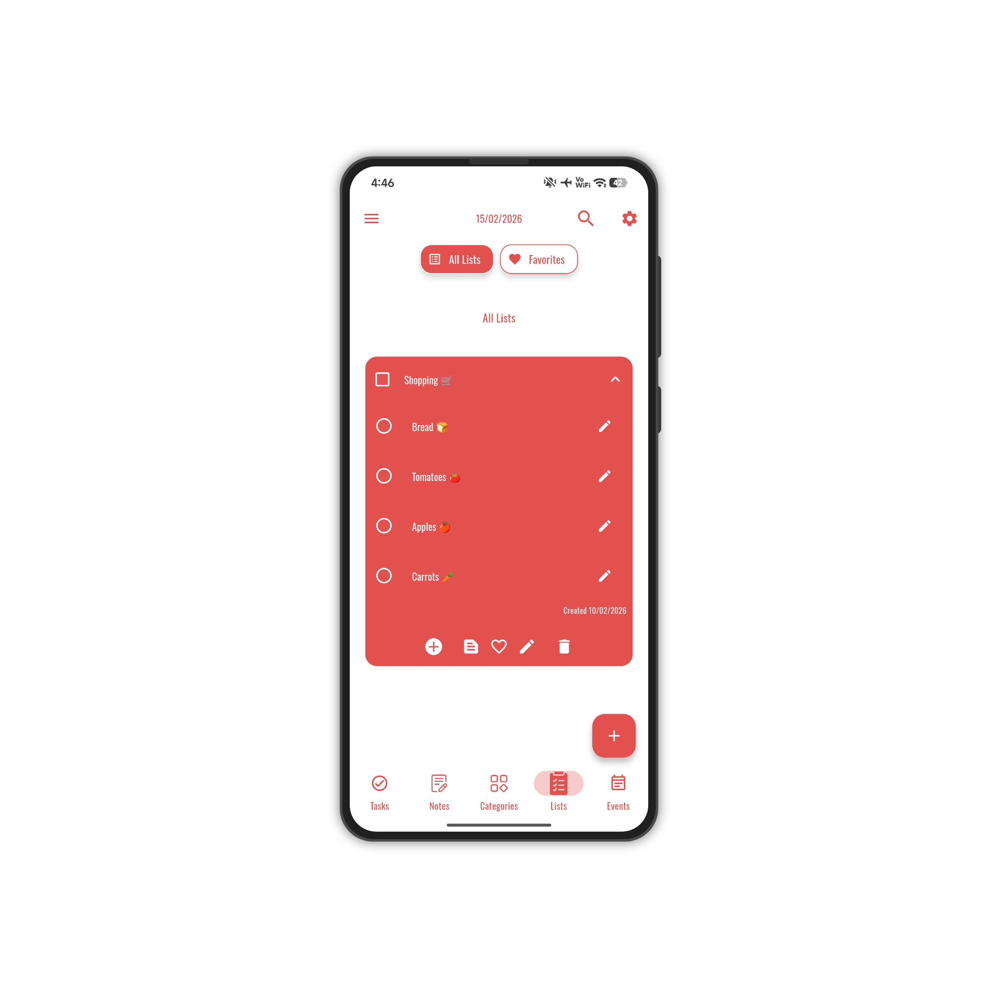 Shopping, packing, to-do — every list organized with inline checkboxes and drag ordering.