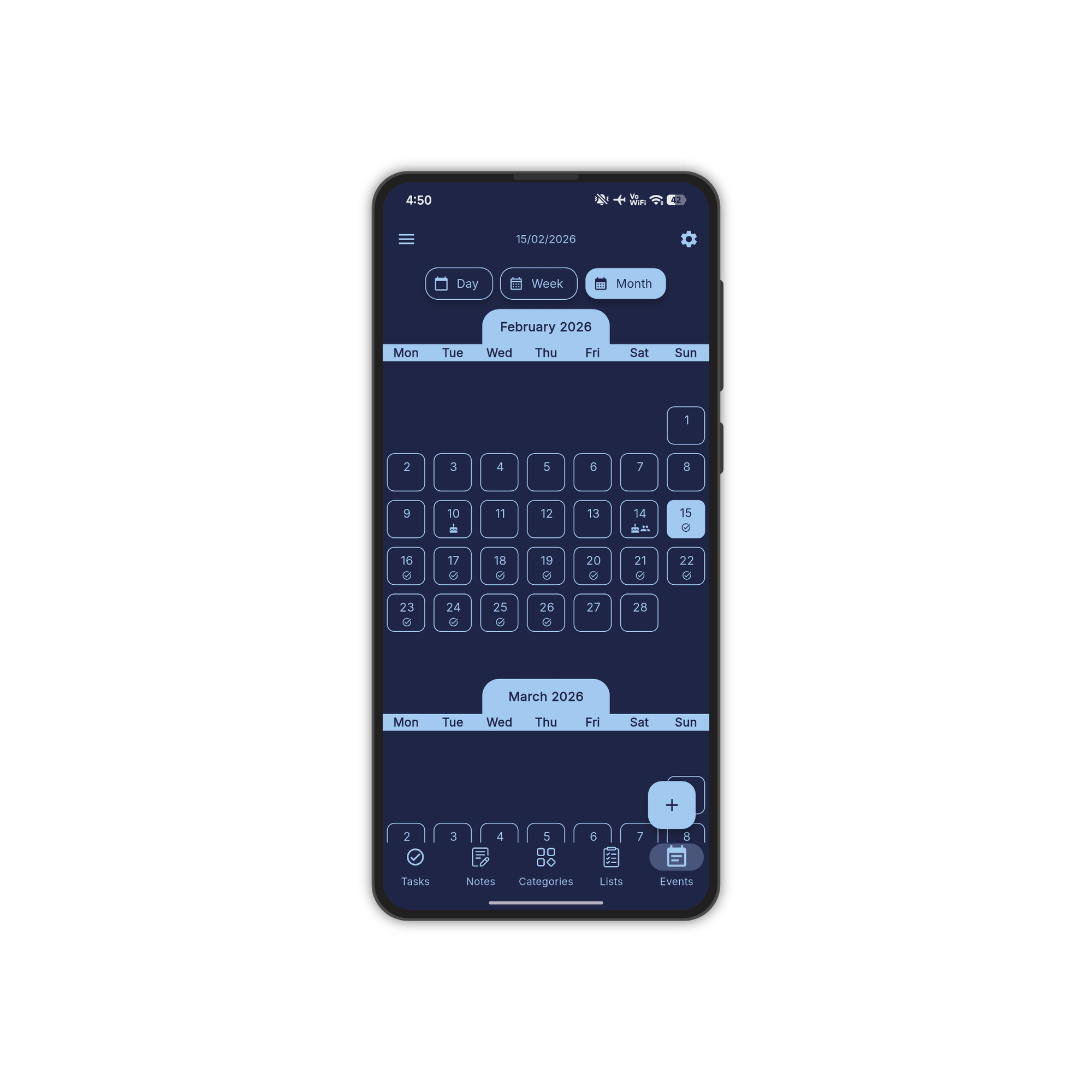 Day, week, and month views. Schedule birthdays, meetings, and tasks at a glance.
